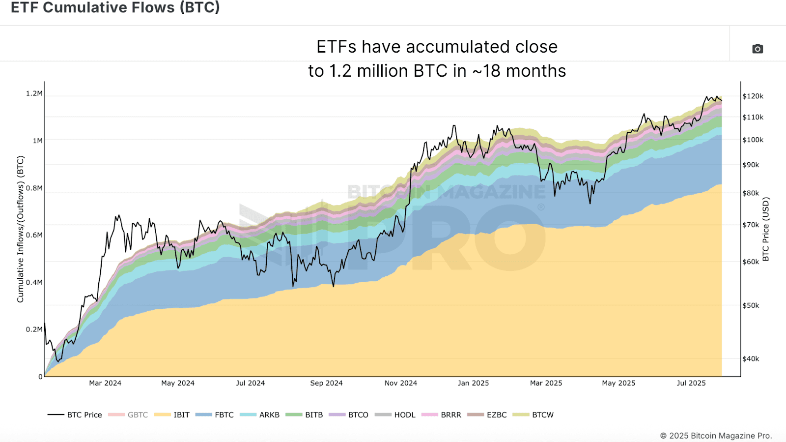 คำว่า “สถาบัน” มักใช้เป็นชวเลขสำหรับผู้ซื้ออีทีเอฟ แต่ในความเป็นจริงการไหลเข้าเหล่านี้เป็นตัวแทนของการผสมผสานของบุคคลที่มีมูลค่าสูง, สำนักงานครอบครัวและกองทุนสถาบันที่เกิดขึ้นจริง บางทีเพียง 30–40% เป็นสิ่งที่เราจะพิจารณาสถาบันที่แท้จริง โดยไม่คำนึงถึง, ETF ไหลสะสม มีการเติบโตอย่างทวีคูณเป็นเกือบ 1.2 ล้าน BTC ตั้งแต่เดือนมกราคม 2567 นั่นเป็นจำนวนเงินที่เปลี่ยนแปลงได้โดยไม่ต้องลบอุปทานที่มีความหมายจากตลาดเปิดอย่างไม่มีกำหนด