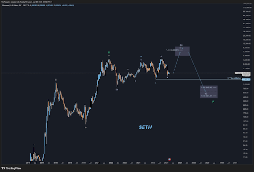 ตาม ถึงนักวิเคราะห์ รู้จักกันในชื่อ The Penguin พฤติกรรมราคาในปัจจุบันของ Ethereum สอดคล้องกับโครงสร้าง Elliott Wave ที่กว้างขึ้นซึ่งได้รับการพัฒนามานานหลายปี การวิเคราะห์กำหนดประวัติราคาทั้งหมดของ Ethereum ตั้งแต่ปี 2559 ว่าเป็นลำดับมาโครที่กำลังพัฒนา: Cycle Wave 1 ที่เสร็จสิ้นแล้วซึ่งมียอดสูงสุด ตามด้วยการแก้ไข Wave 2 ที่ขยายออกไปซึ่งแสดงเป็นทรงตัว ตามที่นักวิเคราะห์กล่าวว่า โครงสร้างนี้ใช้เวลานาน ขาด ๆ หาย ๆ และได้รับการออกแบบมาให้หงุดหงิด