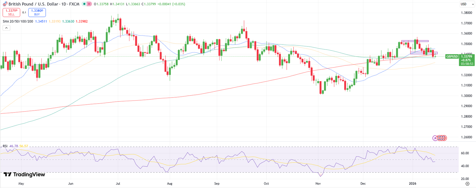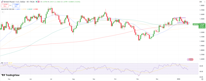 GBP/USD กำลังแข็งตัวหลังจากการปฏิเสธจากโซนแนวต้าน 1.3550-1.3600 ซึ่งบ่งชี้ว่าโมเมนตัมขาขึ้นกำลังจางหายไป ราคาอยู่ต่ำกว่าทั้ง MA 20 และ 50 วัน ซึ่งกำลังทรงตัว สิ่งนี้สนับสนุนอคติที่เป็นกลางถึงเป็นหมีเล็กน้อย RSI กำลังเคลื่อนเข้าสู่เส้นกลาง ซึ่งบ่งชี้ว่าตลาดกำลังรวมตัวมากกว่าที่จะดำเนินต่อไปตามแนวโน้ม