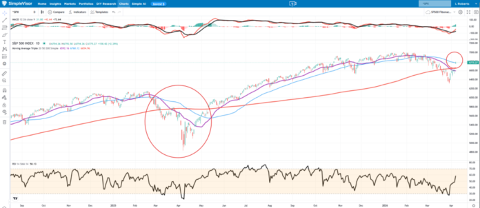 เมื่อเร็ว ๆ นี้ เราสังเกตเห็นตลาดที่แข็งแกร่งควบคู่ไปกับการชะลอตัวของตลาดวันประกาศอิสรภาพที่เกิดจากภาษีในปี 2025 ดังวงกลมด้านล่าง ในเวลานั้น ตลาดร่วงผ่าน 200 DMA แล้วทดสอบจากด้านล่าง แต่ไม่สามารถยืนไว้ได้ แม้ว่ากิจกรรมล่าสุดจะดูคล้ายกัน แต่ตอนนี้เราอยู่เหนือค่าเฉลี่ยเคลื่อนที่อย่างเด็ดขาดและอยู่ที่ 50 DMA (สีน้ำเงิน) เส้นค่าเฉลี่ยเคลื่อนที่จะทำหน้าที่เป็นแนวรับ และเส้นยาวที่ติดอยู่จะทำหน้าที่เป็นแนวต้าน สถานการณ์ในปี 2025 ในวงกลมด้านล่างยังไม่เป็นที่ทราบแน่ชัดในตอนนี้ แน่นอนว่าการหยุดยิงจะมีความเปราะบาง ดังนั้นหัวข้อข่าวจะยังคงมีผลกระทบอย่างมากต่อราคา