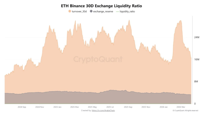 รายงาน CryptoQuant ที่ติดตามโครงสร้างสภาพคล่องของ Ethereum บน Binance ได้ระบุเงื่อนไขที่อยู่ใต้การเคลื่อนไหวของราคาโดยตรง: อัตราส่วนสภาพคล่องลดลงเหลือประมาณ 5.01 ซึ่งเป็นการอ่านที่ต่ำที่สุดนับตั้งแต่ต้นปี 2569 ในขณะเดียวกัน มูลค่าการซื้อขายสะสม 30 วันก็ลดลงเหลือประมาณ 16.65 ล้าน ETH ซึ่งต่ำกว่าระดับการไหลเข้ารายเดือนที่ 20 ถึง 25 ล้าน ETH ซึ่งเป็นลักษณะเฉพาะของช่วงการซื้อขายที่มีการใช้งานมากที่สุดของ Ethereum 2025.