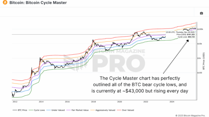 ในอดีต เส้นสีเขียว “Cycle Lows” นี้ชี้ให้เห็นจุดต่ำสุดของ Bitcoin ด้วยความเกือบจะสมบูรณ์แบบ จาก 160 ดอลลาร์ในปี 2558 เป็น 3,200 ดอลลาร์ในปี 2561 และอีกครั้งที่ 15,500 ดอลลาร์ในช่วงปลายปี 2565 ณ วันนี้ กลุ่มนี้อยู่ที่ประมาณ 43,000 ดอลลาร์และเพิ่มขึ้นทุกวัน ซึ่งเป็นพื้นฐานที่มีประโยชน์ในการประเมินว่า Bitcoin จะร่วงลงได้ไกลแค่ไหนในรอบถัดไป