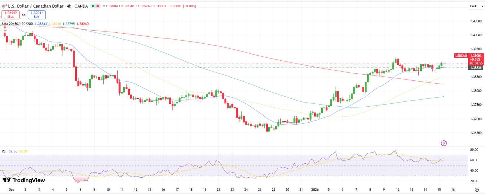 กราฟราย 4 ชั่วโมงสำหรับ USD/CAD แสดงให้เห็นว่าราคาฟื้นตัวอย่างต่อเนื่องจากระดับต่ำสุดในเดือนธันวาคม และตอนนี้กำลังกดดันแนวต้านในช่วง 1.3890–1.3920 ราคาซื้อขายอยู่เหนือ 20? และ MA ระยะ 50? ให้การสนับสนุนในบริเวณใกล้เคียง