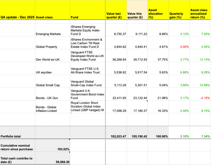 การคืนสินค้าทั้งหมดในโพสต์นี้เป็นผลตอบแทนรวมที่ระบุเป็น GBP เว้นแต่จะระบุไว้เป็นอย่างอื่น ลบประมาณ 3% ออกจากตัวเลขผลการดำเนินงานต่อปีของพอร์ตโฟลิโอเพื่อประเมินผลตอบแทนที่แท้จริงหลังอัตราเงินเฟ้อ