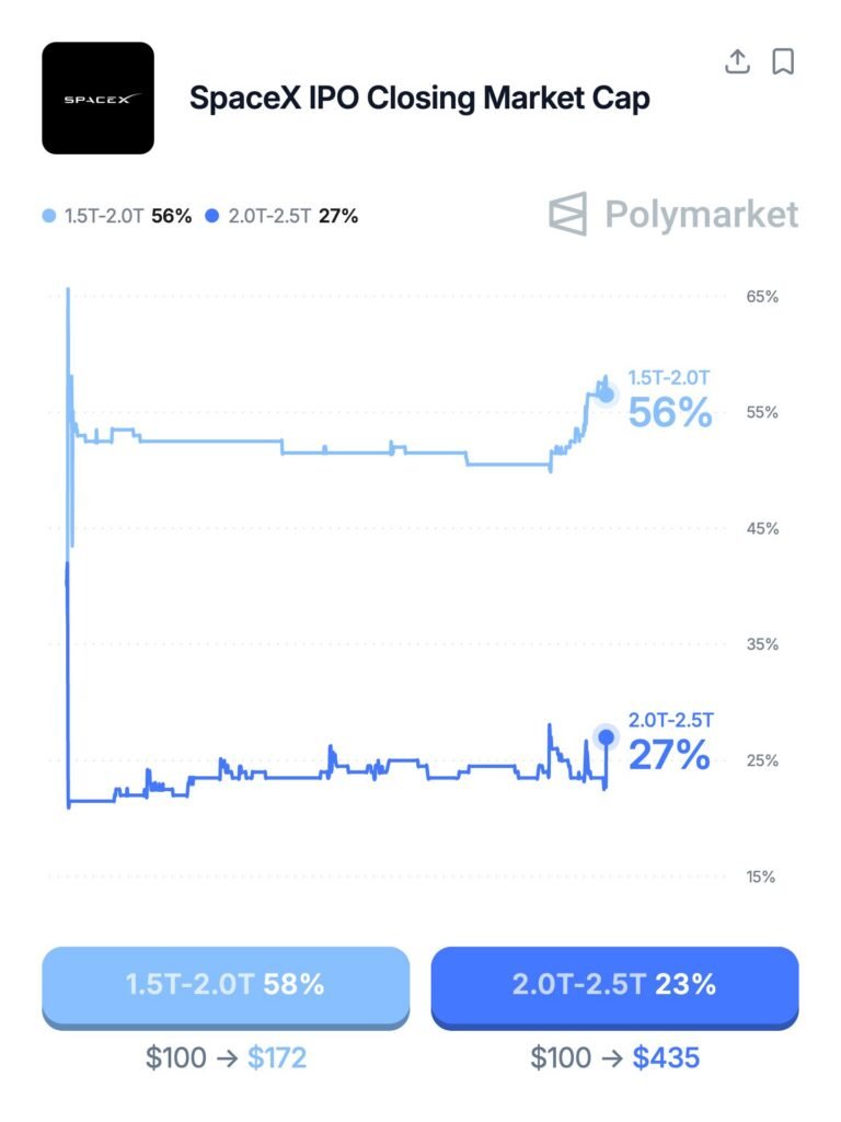 อาหารจานหลักที่นำเสนอน่าจะเป็น SpaceX ของ Elon Musk SpaceX ยื่นฟ้องต่อ SEC อย่างเป็นความลับเมื่อวันที่ 1 เมษายน โดยตั้งเป้าเข้าจดทะเบียนในเดือนมิถุนายนด้วยมูลค่าที่อาจเกิน 1.75 ล้านล้านดอลลาร์ ตามภาพด้านล่างนี้ นักเดิมพัน Polymarket กำหนดโอกาส 27% ที่จะมีมูลค่ามากกว่า 2 ล้านล้านดอลลาร์ ทำให้เป็นบริษัทมหาชนที่ใหญ่เป็นอันดับ 6 ในอเมริกา ไม่จำเป็นต้องพูด แต่มันจะทำลายสถิติตลาดสาธารณะทั้งหมด การประเมินมูลค่าได้รับการสนับสนุนจากการควบรวมกิจการของ SpaceX และ xAI เมื่อเร็วๆ นี้ ซึ่งสร้างสิ่งที่ Musk อธิบายว่า: