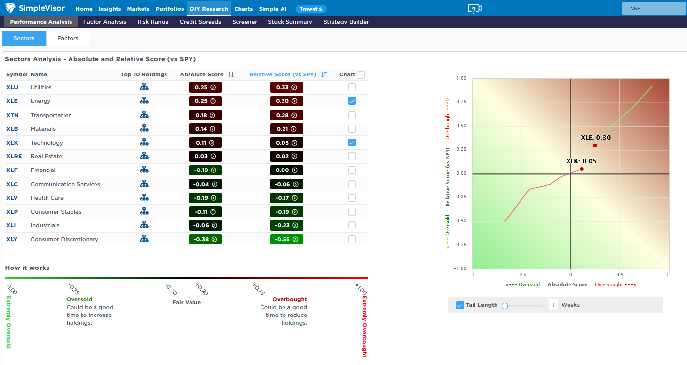 ในช่วงเดือนที่ผ่านมา ภาคพลังงานมีการซื้อมากเกินไป ในขณะที่เทคโนโลยีเป็นหนึ่งในภาคที่มีการขายมากเกินไป สัปดาห์ที่แล้วกระแสน้ำพลิกผัน ตามที่เราแบ่งปันด้านล่างนี้ได้รับความอนุเคราะห์จาก ง่ายVisorพลังงาน (XLE) เห็นว่าคะแนนสัมบูรณ์และคะแนนสัมพัทธ์เปลี่ยนจากการซื้อมากเกินไปอย่างมาก (มุมบนขวา) ไปสู่มูลค่ายุติธรรม ในเวลาเดียวกัน เทคโนโลยี (XLK) ได้ย้ายจากมุมล่างซ้ายไปยังระดับที่มีการซื้อมากเกินไปเล็กน้อย