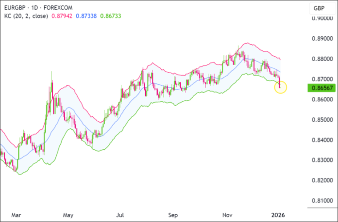 ล่าสุดปิดทุกวันที่ 0.865570 ผลักดันให้ EUR/GBP อยู่ต่ำกว่าขอบเขต Keltner Channel ล่างปัจจุบันที่ 0.867123 หลังจากก่อนหน้านี้ปิดเหนือระดับ 0.870700 เทียบกับแบนด์ล่างใกล้ 0.868631