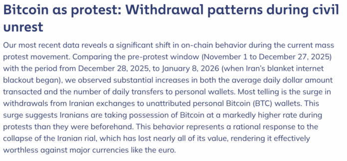 หนึ่งในแนวโน้มที่ชัดเจนที่สุดที่ระบุในรายงานคือการถอน Bitcoin ไปยังกระเป๋าสตางค์ส่วนตัวเพิ่มขึ้นอย่างรวดเร็วในระหว่างนั้น การประท้วงครั้งใหญ่ในช่วงปลายปี 2568 และต้นปี 2569. เมื่อเปรียบเทียบกิจกรรมก่อนการประท้วงจะเริ่มต้นขึ้นในช่วงเวลาที่อินเทอร์เน็ตทั่วประเทศอิหร่านดับในวันที่ 8 มกราคม Chainalysis สังเกตเห็นการเพิ่มขึ้นอย่างรวดเร็วทั้งปริมาณธุรกรรมและการโอนจากการแลกเปลี่ยนของอิหร่านไปยังกระเป๋าเงิน Bitcoin ที่ดูแลตนเอง
