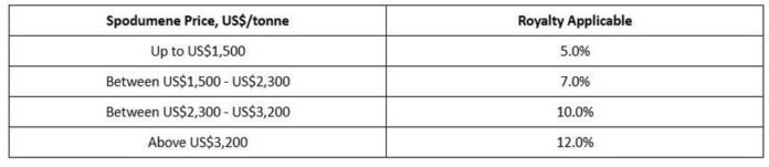 บริษัทตั้งข้อสังเกตว่าหลังจากสิ้นสุดระยะเวลาการพิจารณา 21 วัน ตราสารนิติบัญญัติฉบับใหม่ ข้อบังคับเกี่ยวกับแร่และเหมืองแร่ (ค่าภาคหลวง) ปี 2025ซึ่งสรุปมาตราส่วนแบบเลื่อนต่อไปนี้ที่เกี่ยวข้องกับอัตราค่าภาคหลวงสำหรับโครงการลิเธียมในกานา ได้กลายเป็นผลผูกพันทางกฎหมาย