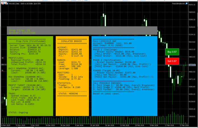 เวอร์ชันสาธิตทำงานในตัวทดสอบกลยุทธ์ MT5 โดยเปิดใช้งานโหมดโบรกเกอร์จำลอง EA ดำเนินการจำลองความท้าทายเต็มรูปแบบ — ไม่ว่าจะบรรลุเป้าหมายกำไรที่กำหนดไว้หรือฝ่าฝืนขีดจำกัดการเบิกถอน เหมือนกับที่ทำกับความท้าทายแบบเรียลไทม์ โบรกเกอร์จำลองจะติดตามตำแหน่งฝ่ายตรงข้ามตลอดและแสดงยอดคงเหลือ อิควิตี้ และผลการดำเนินงานบนแผนภูมิควบคู่ไปกับบัญชีของบริษัท การแสดงแผนที่วงจรชีวิตและดัชนี POBE สามารถมองเห็นได้ตลอดการทดสอบ