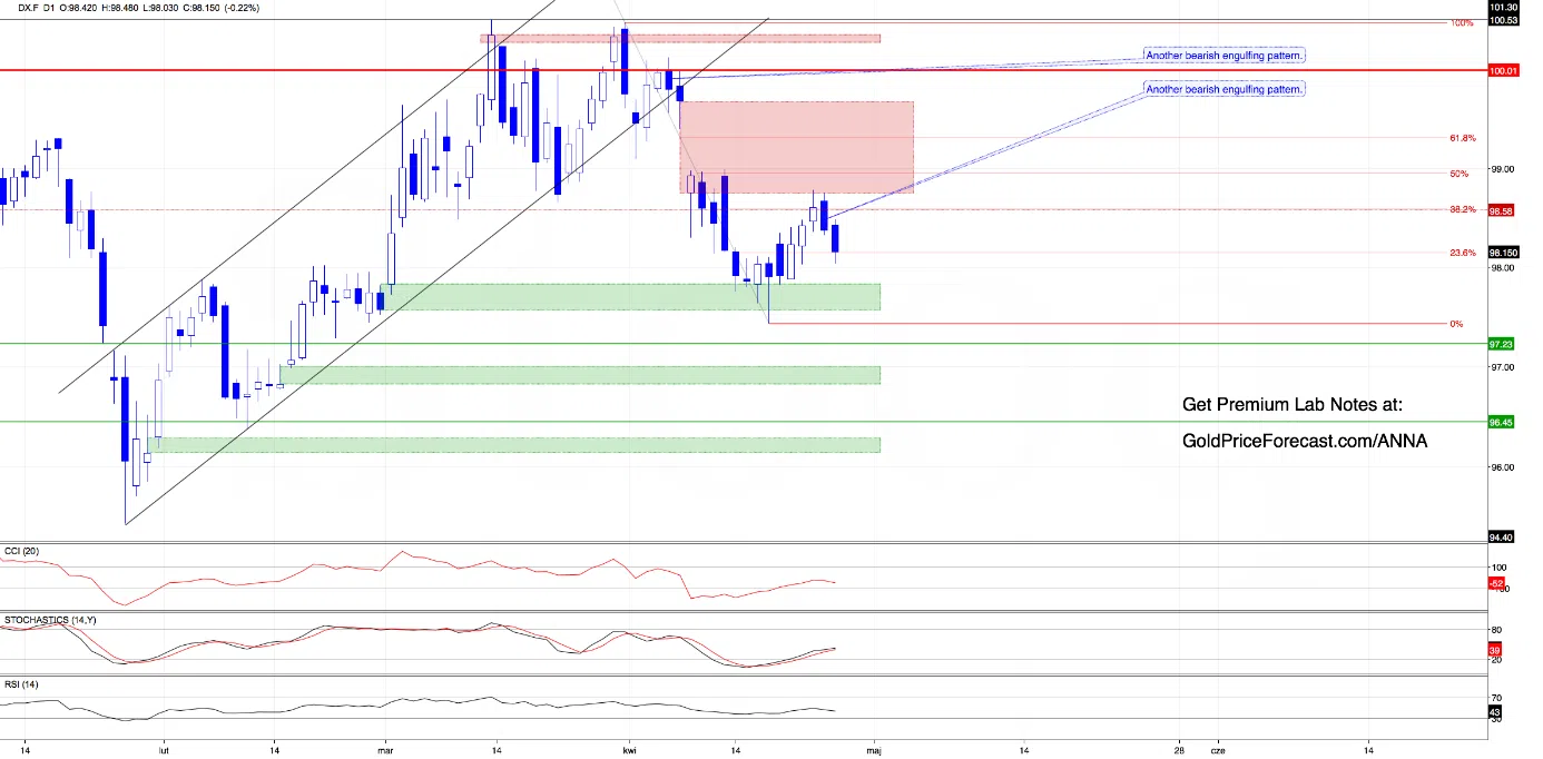 นั่นสำคัญเพราะรูปแบบแท่งเทียนที่คล้ายกันมากถือเป็นจุดเริ่มต้นของการขายในเดือนเมษายน เมื่อเราเพิ่มปัจจัยอีกสองประการนี้ (ช่องว่างตลาดกระทิงสองช่องถูกทำให้เป็นกลาง และการฝ่าวงล้อมก่อนหน้านี้เหนือ Fibonacci retracement 38.2% ไม่ถูกต้อง) เราจะเห็นว่าภาพทางเทคนิคอ่อนลงอย่างเห็นได้ชัด