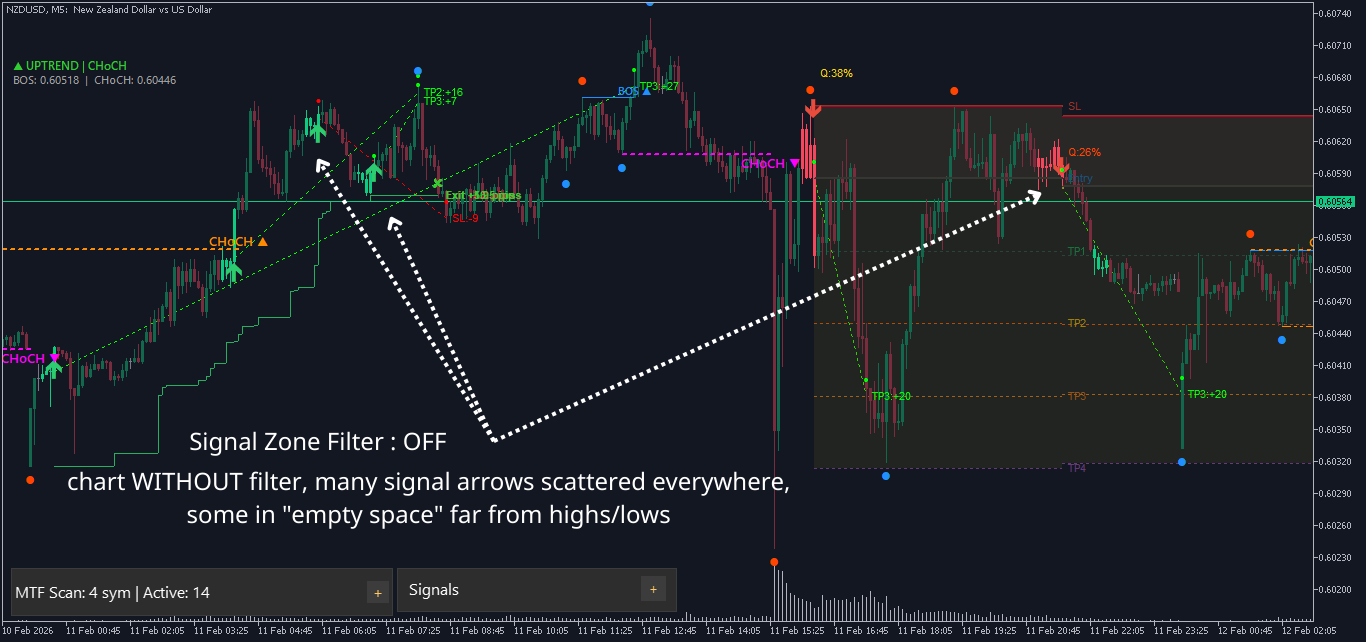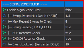 ตัวกรองโซนสัญญาณช่วยกำจัดสัญญาณที่ปรากฏในตำแหน่ง “ลอยตัว” ซึ่งหมายความว่าสัญญาณเหล่านั้นไม่ได้อยู่ใกล้โซนราคาที่สำคัญใดๆ จะเก็บเฉพาะสัญญาณที่เชื่อมต่อกับโซนโครงสร้างตลาด (สวิงสูง/ต่ำ, BOS, CHoCH)