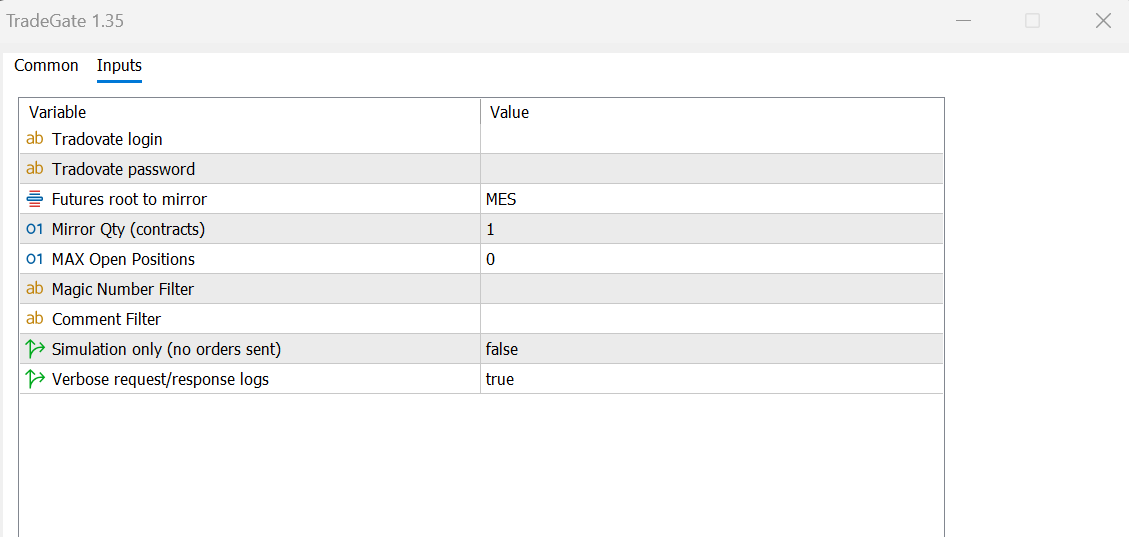 หนึ่งอินสแตนซ์ต่อการแมป: กระจก TradeGate เฉพาะสัญลักษณ์ของแผนภูมิที่แนบมาด้วย– หากคุณต้องการจำลอง CFD หลายรายการ (US500, USTEC, DE40…) แนบอินสแตนซ์แยกต่างหาก ของ EA ในแต่ละชาร์ตและกำหนดความเหมาะสม ฟิวเจอร์สหยั่งรากเพื่อสะท้อน ในแต่ละกรณี