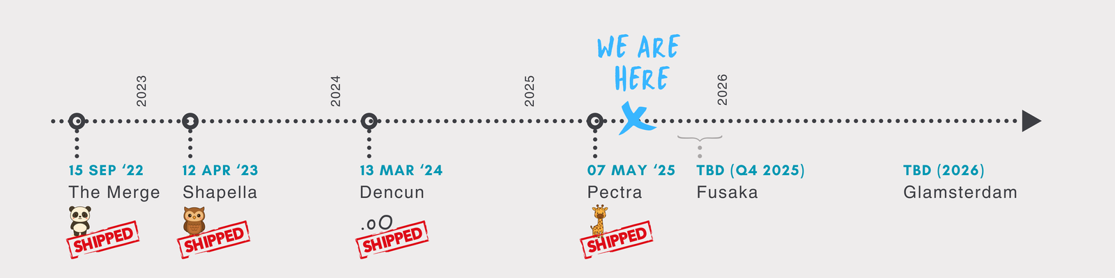 เพื่อให้ Fusaka เปิดตัวก่อน DevConnect ลูกค้าจำเป็นต้องลดการเผยแพร่ในช่วงกลางเดือนถึงปลายเดือนสิงหาคมและการอัพเกรด TestNet จำเป็นต้องเห็นปัญหาที่น้อยที่สุด นั่นจะทำการอัพเกรด Mainnet ในต้นเดือนพฤศจิกายน อย่างไรก็ตามหากเราโจมตีอุปสรรค์เราจะเสียเวลาสองสามสัปดาห์และมันค่อนข้างไม่สมจริงที่จะคาดหวังว่านักพัฒนาหลักจะพร้อมใช้งานในระหว่างการประชุมที่มีขนาดใหญ่มากเช่น DevConnect เรา สามารถ ดูการอัพเกรดโพสต์ Devconnect, Pre-Vacation ‘improve (และเรามีในอดีต!) แรงจูงใจในการแยกทางแยกนี้สูงและฉันยังคงคาดหวังว่าจะได้เห็นภายในสิ้นปี