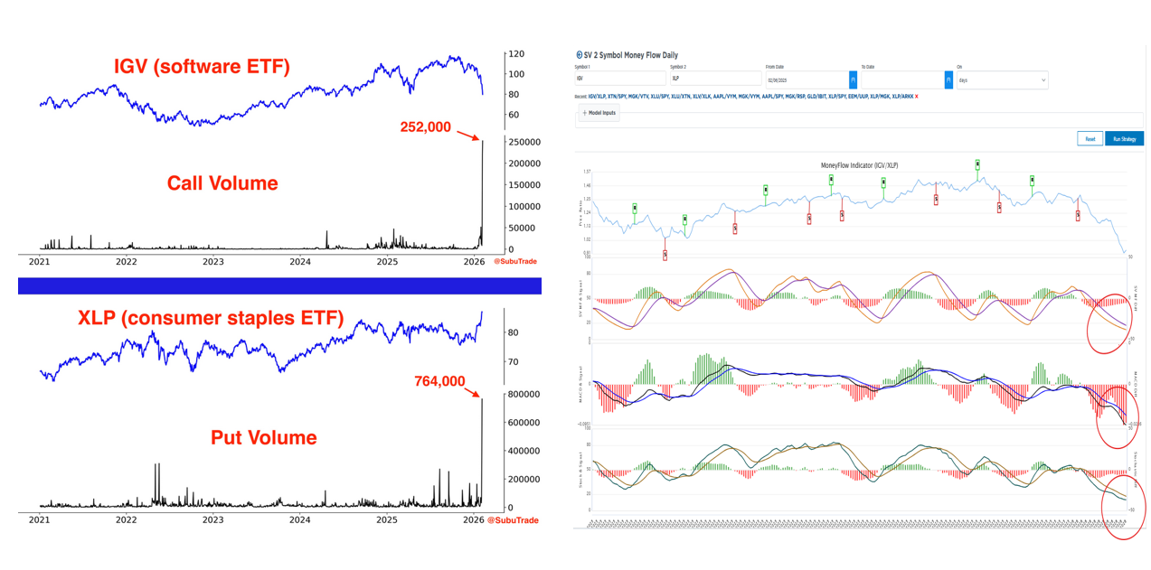 อย่างที่เราเขียนไว้เมื่อวาน ความเห็นการหมุนเวียนอย่างมีประสิทธิภาพระหว่างภาคส่วนที่มีการซื้อมากเกินไปและขายมากเกินไป ปัจจัย หรือหุ้นเป็นวิธีการที่ได้รับการยอมรับอย่างดีสำหรับตลาดที่มีประสิทธิภาพเหนือกว่า เช่นเดียวกับกลยุทธ์อื่นๆ ส่วนที่ยากคือจังหวะเวลาหรือการประเมินอย่างเหมาะสมเมื่อคู่ของภาคส่วน ปัจจัย หรือหุ้นกำลังจะพลิกกลับแนวโน้มตามลำดับ ในปัจจุบัน มีความแตกต่างอย่างมากระหว่างหุ้นซอฟต์แวร์และสินค้าหลักของผู้บริโภค จนถึงปี 2026 ซอฟต์แวร์ ETF, IGV ลดลง 20% ในขณะที่ XLP ซึ่งเป็น ETF หลักของผู้บริโภคเพิ่มขึ้น 12% และ S&P ทรงตัวในปีนี้ ถึงเวลาขายลวดเย็บกระดาษและซื้อซอฟต์แวร์แล้วหรือยัง?