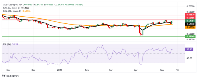 คู่ AUD/USD ซื้อขายใกล้ 0.6470 ในวันพุธ เกี่ยวกับเทคนิค การวิเคราะห์ ของแผนภูมิรายวันแสดงถึงรั้น มุมมองด้วยการซื้อขายทั้งคู่เหนือค่าเฉลี่ยเคลื่อนที่แบบเอ็กซ์โปเนนเชียลเก้าวัน (EMA) นอกจากนี้ดัชนีความแข็งแรงสัมพัทธ์ 14 วัน (RSI) ยังเกินกว่า 50 มาร์คซึ่งเป็นการเสริมความเชื่อมั่นในรั้น
