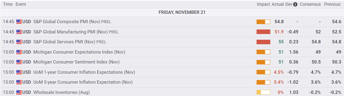 ผลการสำรวจความเชื่อมั่นผู้บริโภคของมหาวิทยาลัยมิชิแกน (UoM) ก็ออกมาดีเกินคาด ซึ่งช่วยหนุนความเชื่อมั่นของนักลงทุนในการปิดท้ายสัปดาห์ที่น่าหวาดกลัวอย่างท่วมท้นในตลาด ดัชนีความเชื่อมั่นและความคาดหวังของผู้บริโภค UoM เพิ่มขึ้นมากกว่าที่คาดไว้ในเดือนพฤศจิกายน และความคาดหวังเงินเฟ้อผู้บริโภคใน 1 ปีและ 5 ปีก็ลดลงเช่นกัน
