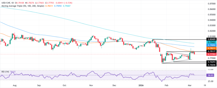 คู่ USD/CHF ถอยกลับในวันศุกร์ระหว่างเซสชั่นอเมริกาเหนือ ลดลง 0.53% เนื่องจากดอลลาร์อ่อนค่าลงตามรายงานการจ้างงานที่น่าตกต่ำ และทำลายระดับต่ำสุดในรอบสี่วันต่ำกว่าตัวเลข 0.7800 ในขณะที่เขียนบทความนี้ ราคาซื้อขายที่ 0.7771 แต่ยังคงปิดท้ายสัปดาห์ด้วยการเพิ่มขึ้นมากกว่า 1%