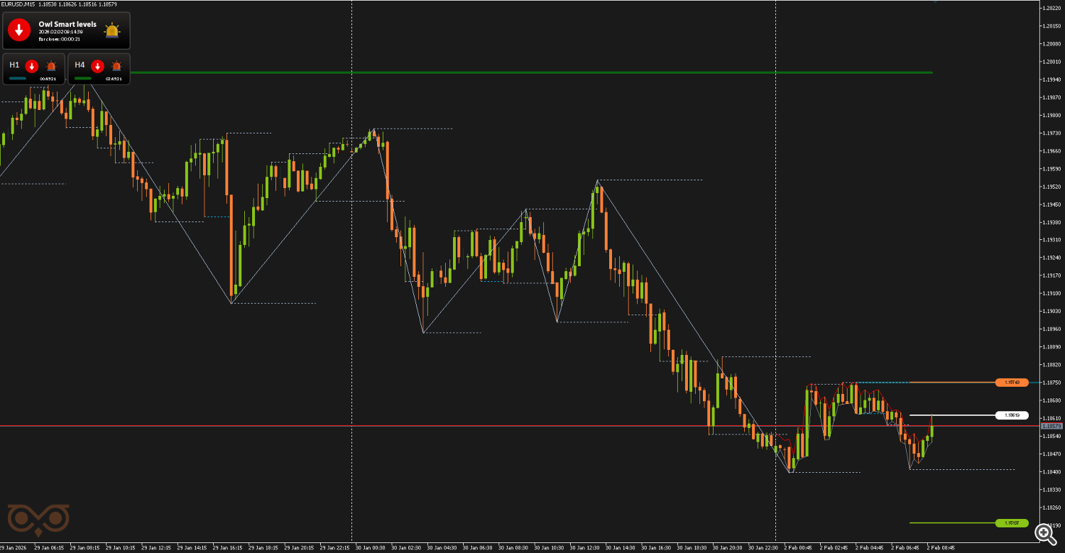 การซื้อขายครั้งแรกในคู่สกุลเงิน EURUSD เปิดขึ้นโดยสัญญาณของตัวบ่งชี้ Owl Good Ranges ในวันจันทร์ที่ 2 กุมภาพันธ์ 2026 ในกรอบเวลา M15 หลังจากยืนยันทิศทางการเคลื่อนไหวในกรอบเวลา H1 และ H4