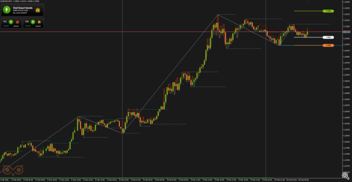 เพื่อความสะดวกและรับสัญญาณได้ทันท่วงที ผมจึงใช้ ตัวบ่งชี้ระดับนกฮูกอัจฉริยะ. กรอบเวลาการซื้อขายหลักคือ M15 ในขณะที่กรอบเวลา H1 และ H4 ใช้เพื่อยืนยันทิศทางแนวโน้มของกรอบเวลาที่สูงกว่า