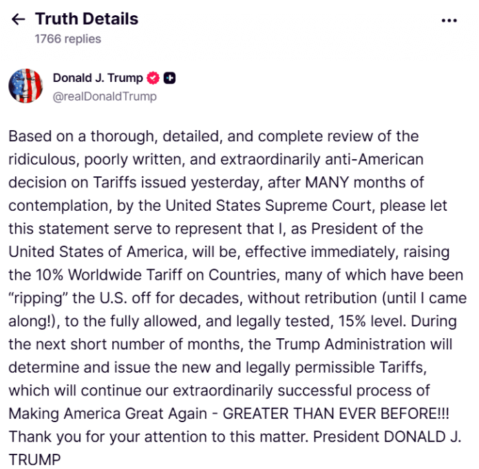 ประธานาธิบดีโดนัลด์ ทรัมป์ ประกาศเมื่อวันเสาร์ให้เพิ่มภาษีทั่วโลกทันทีจาก 10% เป็น 15% ซึ่งเป็นการเคลื่อนไหวที่เห็นกันอย่างแพร่หลายว่าเป็นการตอบสนองต่อคำตัดสินของศาลเมื่อวันศุกร์ ซึ่งทำให้หน้าที่บางอย่างที่เขากำหนดภายใต้พระราชบัญญัติอำนาจเศรษฐกิจฉุกเฉินระหว่างประเทศ (IEEPA)