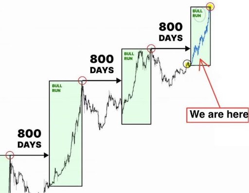 จากแนวโน้มขาขึ้นที่เกิดขึ้นซ้ำๆ นี้ Thagapsov คาดการณ์ว่าราคา BTC จะเพิ่มขึ้น 450% เป็น 330,000 ดอลลาร์ในรอบตลาดปี 2024 ระหว่างแต่ละ วัฏจักรสี่ปีทากาปซอฟได้นับไว้ประมาณ 800 วันก่อน การวิ่งของ Bitcoinจากแผนภูมิราคานี้ แสดงให้เห็นว่าตลาดได้เข้าสู่ช่วงขาขึ้นแล้ว และกำลังค่อยๆ เพิ่มโมเมนตัมจนอาจแตะจุดสูงสุดตลอดกาลในเร็วๆ นี้