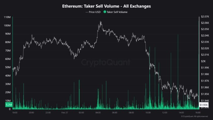 ในโพสต์เมื่อวันที่ 27 กุมภาพันธ์บนแพลตฟอร์มโซเชียลมีเดีย ผู้เชี่ยวชาญด้าน crypto Maartunn เปิดเผย แหล่งที่มาของแรงกดดันขาลงล่าสุดที่เห็นได้จากราคา Ethereum ตัวบ่งชี้ออนไลน์ที่เกี่ยวข้องที่นี่คือ Taker Promote Quantity ซึ่งเพิ่มขึ้นอย่างต่อเนื่องจากการแลกเปลี่ยนทั้งหมดตลอดวันศุกร์