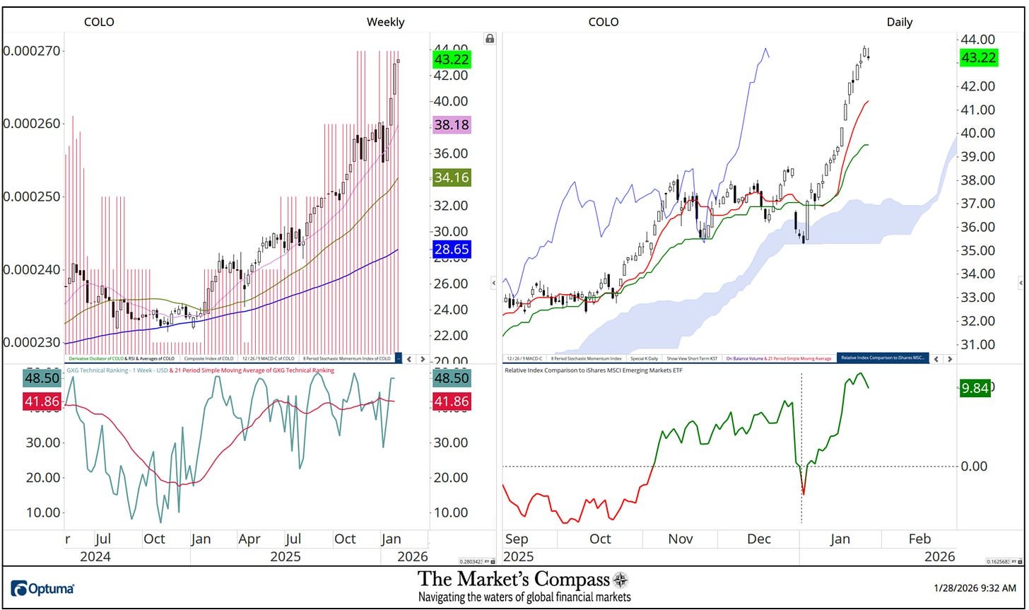 ทางด้านขวาของแผนภูมิรายสัปดาห์คือแผนภูมิคลาวด์รายวัน ในแผงด้านล่างของแผนภูมินั้นคือเส้นเปรียบเทียบดัชนีสัมพัทธ์เทียบกับ iShares Rising Markets ETF หรือ EEM ที่เน้นประสิทธิภาพที่เหนือกว่าเมื่อเทียบกับ EEM ที่เริ่มต้นในช่วงต้นปี (กากบาทเส้นประสีดำ) แม้ว่าตัวเลขที่มีประสิทธิภาพดีกว่าจะไม่แสดงเป็น % ต่อ se แต่ตัวเลขทางด้านขวาคือเปอร์เซ็นต์ที่มีประสิทธิภาพดีกว่า ตัวอย่างเช่น International X Columbia ETF ซึ่งเป็นแผนภูมิแรกที่นำเสนอ เพิ่มขึ้น 9.84% เทียบกับ EEM นับตั้งแต่ต้นปี จากสามภูมิภาคทางภูมิศาสตร์ที่ครอบคลุมอยู่ใน Rising Markets Nation ETF Research ซึ่งครอบคลุม 20 ETF ที่เป็นตัวแทนของเอเชีย/แปซิฟิก EMEA และละตินอเมริกา Lat/Am มีประสิทธิภาพเหนือกว่าอีกสองภูมิภาคอย่างมากนับตั้งแต่ต้นปี