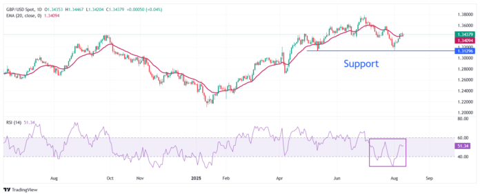 เงินปอนด์สเตอร์ลิงซื้อขายแบนประมาณ 1.3440 กับดอลลาร์สหรัฐในวันอังคาร คู่ GBP/USD ถือค่าเฉลี่ยเคลื่อนที่แบบเอ็กซ์โปเนนเชียล 20 วัน (EMA) ซึ่งซื้อขายประมาณ 1.3408 ซึ่งชี้ให้เห็นว่าแนวโน้มระยะสั้นนั้นเป็นที่โปรดปราน