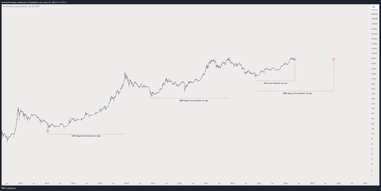 นักวิเคราะห์นามแฝงอมตะ บอก ผู้ติดตาม 213,200 คนของเขาบนแพลตฟอร์มโซเชียลมีเดีย X ซึ่งเมื่อพิจารณาจากระยะเวลาในอดีตของวงจรตลาด Bitcoin จะสูงกว่านี้มาก