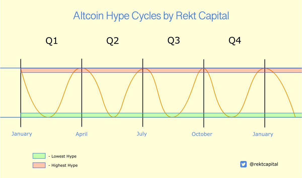 นักวิเคราะห์นามแฝง Rekt Capital บอก ผู้ติดตาม 467,200 คนของเขาบนแพลตฟอร์มโซเชียลมีเดีย X ซึ่ง “วงจรการโฆษณาเกินจริง” มีแนวโน้มว่าจะเกิดขึ้นในไตรมาสที่สองของปีเมื่อตลาดรวมตัว