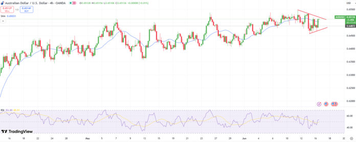 แผนภูมิ AUD/USD 4 ชั่วโมงแสดงให้เห็นว่าราคากำลังสั่นคลอนรอบ SMA 20 ช่วงเวลา เทียนสองตัวสุดท้ายแสดงแรงกดดันในการซื้อทำให้ราคาปิดเหนือระดับ 20-SMA แผนภูมิยังแสดงรูปแบบความต่อเนื่องที่เรียกว่า “ธง” ดังนั้นความน่าจะเป็นของการฝ่าวงล้อมก็มีอยู่เช่นกัน