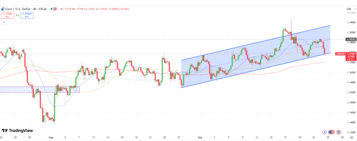 แผนภูมิ EUR/USD 4 ชั่วโมงแสดงการรวมราคาการดำเนินการภายในช่องทางที่เพิ่มขึ้น ราคาดังกล่าวต่ำกว่า MA 20 ช่วงเวลาโดยมีเป้าหมายเพื่อทดสอบการสนับสนุนช่องประมาณ 1.1730 ก่อนการสนับสนุน MA 200 ช่วงเวลาที่ 1.1700