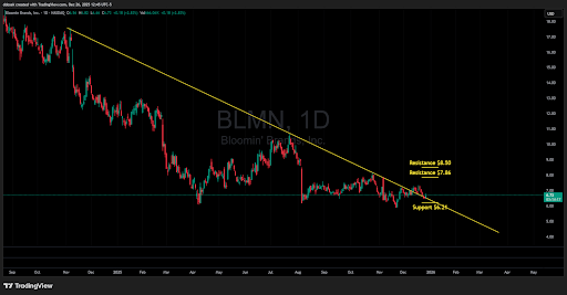 เมื่อพิจารณาจากแผนภูมิ การเปลี่ยนแปลงทางเทคนิคที่โดดเด่นเกิดขึ้นในวันที่ 11 ธันวาคม 2025 เมื่อ BLMN ทะลุเส้นแนวโน้มที่ลดลงในระยะยาวที่เกิดขึ้นตั้งแต่เดือนพฤศจิกายน 2024 ในที่สุด หลังจากการทะลุกรอบดังกล่าว ขณะนี้ราคาได้กลับมาทดสอบจุดสูงสุดของเส้นแนวโน้มเดียวกันนั้น แม้ว่าการตั้งค่านี้มักจะเป็นจุดเริ่มต้นที่น่าสนใจสำหรับการตีกลับ แต่เราก็ต้องระมัดระวัง การเก็บเกี่ยวที่สูญเสียภาษีในช่วงปลายปีมักจะบังคับให้ปิดสถานะและทำให้เกิดการทะลุทะลวง