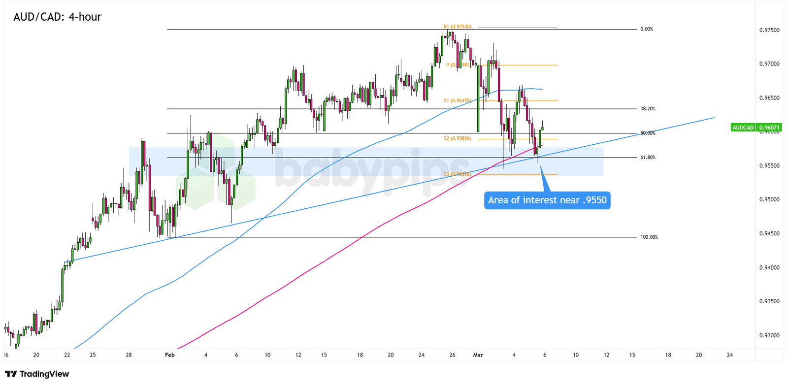 เมื่อเร็วๆ นี้ AUD/CAD ลดลงจากบริเวณ .9750 และตอนนี้มีการซื้อขายใกล้กับโซน .9600 มากขึ้น บริเวณ .9550 – .9600 น่าจับตามอง เนื่องจากเป็นแนวเดียวกับเส้น Fibonacci retracement 61.8% ของการแกว่งตัวขึ้นในเดือนกุมภาพันธ์, 200 SMA ของกราฟราย 4 ชั่วโมง และเส้น Pivot Level ของกราฟราย 4 ชั่วโมง