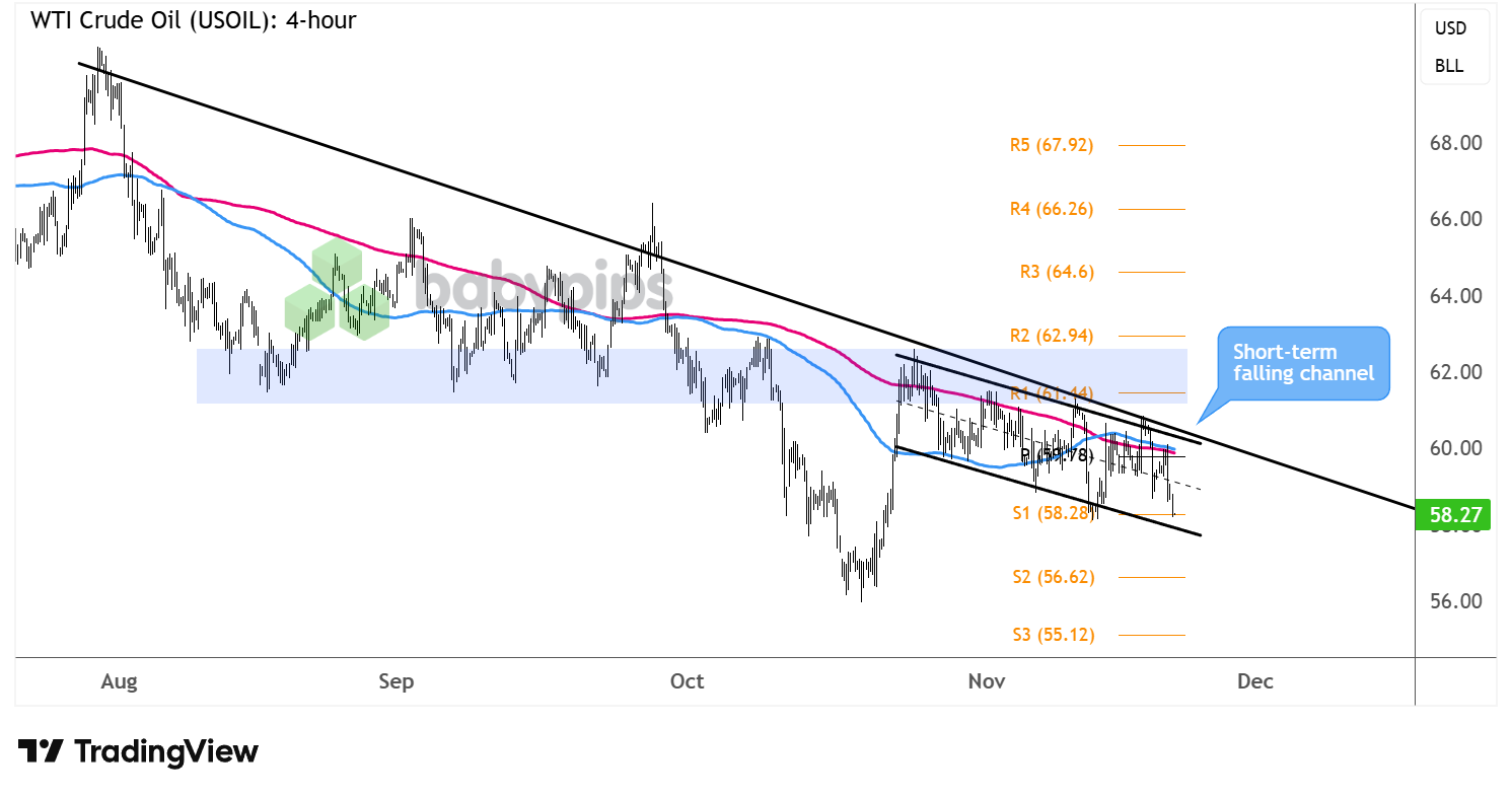 มองหาการทะลุกรอบด้านล่างของช่องระยะสั้นใกล้กับ S1 ($58.28) ซึ่งอาจฉุดราคาสินค้าโภคภัณฑ์ลงใต้ไปยัง S2 ($56.62) หรือแตะระดับต่ำสุดประจำปีใกล้กับระดับ 56 ดอลลาร์ต่อบาร์เรล