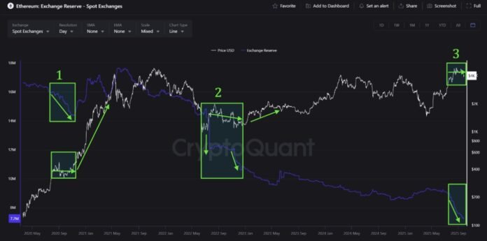 การเพิ่มน้ำหนักให้กับแนวโน้มนี้รายงานสำคัญโดยเน้นที่ Cryptoquant ว่าการจัดหา Ethereum ในการแลกเปลี่ยนสปอตยังคงลดลง แนวโน้มนี้มักจะส่งสัญญาณว่านักลงทุนกำลังถอน ETH ไปสู่การควบคุมตนเองหรือการปักหลักลดสภาพคล่องขายด้านที่มีอยู่ในการแลกเปลี่ยน ในอดีตการลดลงของการแลกเปลี่ยนเงินสำรองได้ปูทางไปสู่การชุมนุมเนื่องจากอุปสงค์ในที่สุดดูดซับอุปทานที่ลดลง