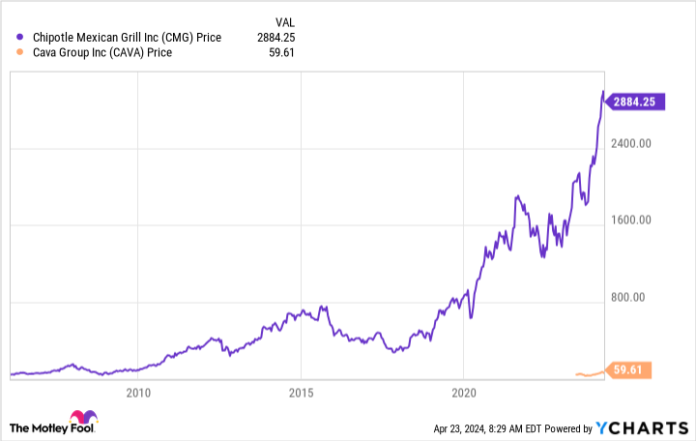 แนวคิดร้านอาหารของ Cava ไม่ใช่เรื่องใหม่จริงๆ โดยพื้นฐานแล้วมันฉีกออก Chipotle เม็กซิกันย่างของ –ซีเอ็มจี 2.41%– วิธีการประกอบอาหารในการประกอบอาหาร แต่ใช้กับอาหารเมดิเตอร์เรเนียนแทนอาหารเม็กซิกัน อย่างไรก็ตาม ข้อเท็จจริงนี้ทำให้การเปรียบเทียบที่นี่ค่อนข้างชัดเจน เพื่อวางรากฐานที่สำคัญ ณ สิ้นปี 2023 Chipotle มีสาขา 3,371 แห่งในสหรัฐอเมริกา (และอีก 66 แห่งในต่างประเทศ) จำนวนร้านค้าของ Cava ณ สิ้นปี 2566 อยู่ที่ 309 แห่ง