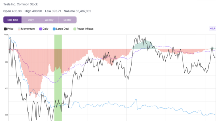 เมื่อเวลา 10:50 น. EST ของวันที่ 18 พฤศจิกายน TSLA ทริกเกอร์สัญญาณ Energy Influx ที่ราคา 396.47 ดอลลาร์ TSLA พบว่าราคาหุ้นลดลงอย่างมากซึ่งนำไปสู่การแจ้งเตือน Energy Influx โดยลดลงมากถึง 3% ในช่วงเวลาเปิดทำการของการซื้อขาย จากการแจ้งเตือนดังกล่าว ความสนใจในการซื้อขายทั้งรายย่อยและสถาบันใน TSLA ขยับไปทางฝั่งซื้อมากขึ้น ส่งผลให้ราคาหุ้นสูงขึ้นอย่างมีนัยสำคัญ และในที่สุดก็แตะระดับสูงสุดหลังการแจ้งเตือนที่ $408.90 เมื่อเวลา 14:45 น. EST สัญญาณ Energy Influx นี้มีวัตถุประสงค์เพื่อเป็นตัวบ่งชี้ถึงความสนใจของสถาบันและผู้ค้าปลีก โดยเน้นที่จุดที่เทรดเดอร์อาจเข้าสู่ตลาดสำหรับหุ้น