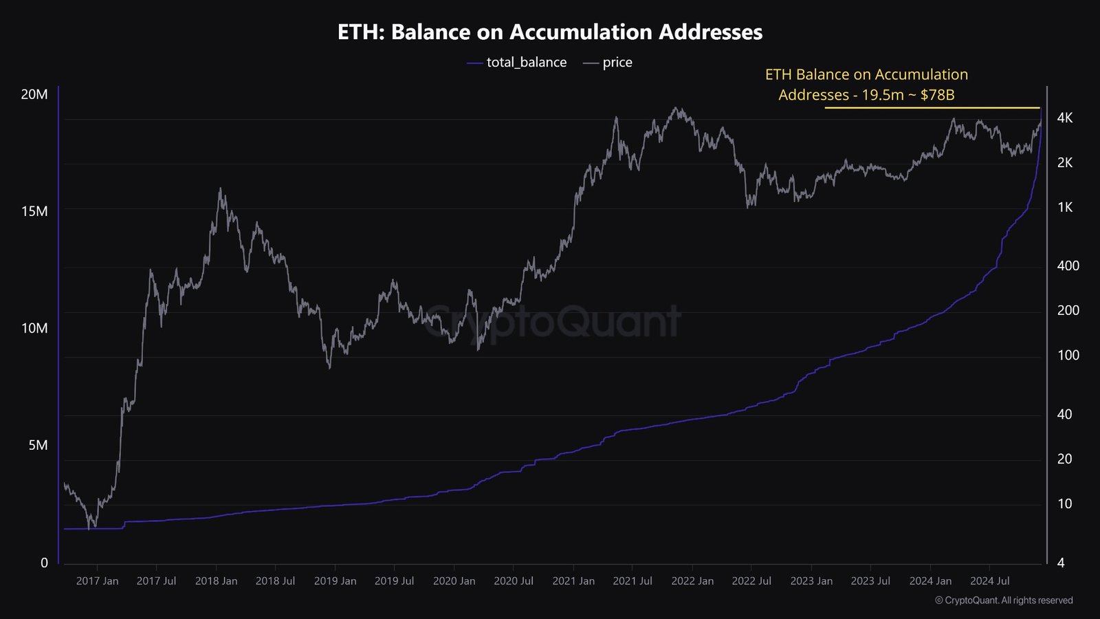 ในชุดของ โพสต์ แชร์บนแพลตฟอร์มโซเชียลมีเดีย X นักวิเคราะห์ CryptoQuant ได้วิเคราะห์ตัวชี้วัดหลักของ Ethereum หนึ่งในข้อสังเกตที่โดดเด่นคือความสมดุลของ Ethereum ที่อยู่สะสม– ที่อยู่เหล่านี้ถือครอง ETH ประมาณ 19.5 ล้าน ETH มูลค่าประมาณ 78 พันล้านดอลลาร์