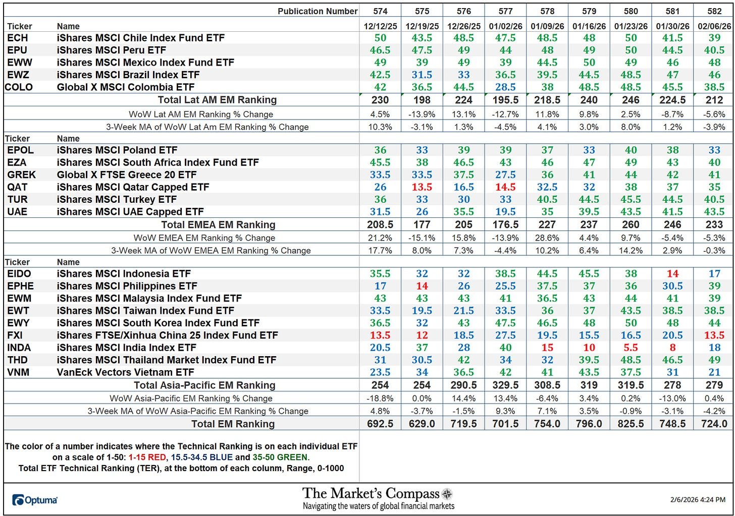 *ระบบการจัดอันดับทางเทคนิคเป็นแนวทางเชิงปริมาณที่ใช้การพิจารณาทางเทคนิคหลายประการ ซึ่งรวมถึงแต่ไม่จำกัดเพียงแนวโน้ม โมเมนตัม การวัดการสะสม/การกระจาย และความแข็งแกร่งสัมพัทธ์ของ ETF ของประเทศ EM แต่ละรายการ 20 รายการ ซึ่งสามารถอยู่ในช่วงระหว่าง 0 ถึง 50 อันดับทางเทคนิคของ EM ทั้งหมด หรือ “TEMTR” คือผลรวมของ TR 20 รายการ และสามารถมองได้ว่าเป็นตัวบ่งชี้การซื้อเกิน / ขายเกิน เช่นเดียวกับการยืนยัน / ไม่ยืนยัน ตัวบ่งชี้ นอกจากนี้ยังมีอันดับรวมสำหรับแต่ละภูมิภาคทางภูมิศาสตร์ที่สามารถดูเป็นการวัดแบบสัมพันธ์ในแต่ละสัปดาห์ต่อสัปดาห์