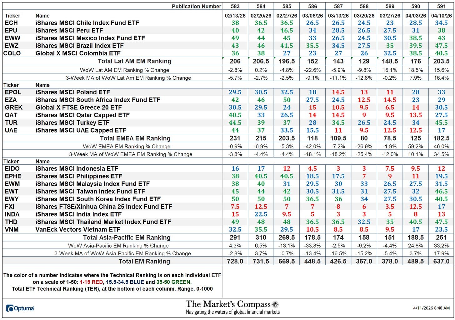 สัปดาห์ที่ผ่านมานี้ อันดับทางเทคนิคของ EM ทั้งหมดหรือ “TEMTR” เพิ่มขึ้น 30.13% เป็น 637 เพิ่มขึ้นจากที่เพิ่มขึ้น 29.50% ในสัปดาห์ก่อนเป็น 489.5 จาก 378 เมื่อสามสัปดาห์ก่อน การจัดอันดับ EMEA ทั้งหมดเพิ่มขึ้นมากที่สุดจากสามภูมิภาคทางภูมิศาสตร์เมื่อสัปดาห์ที่แล้ว +46.0% เป็น 182.5 จาก 125 เมื่อสองสัปดาห์ก่อน โดยเพิ่มขึ้น 59.2% จากสัปดาห์สิ้นสุดวันที่ 27 มีนาคม เมื่อถึงจุดต่ำสุดที่ 78.5 สัปดาห์ที่แล้ว อันดับรวมเอเชียแปซิฟิกเพิ่มขึ้น 33.2% เป็น 251 จาก 188.5 ในสัปดาห์ก่อน การจัดอันดับ Lat AM ทั้งหมดเพิ่มขึ้น 15.6% เป็น 203.5 จาก 176 ในสัปดาห์ก่อน