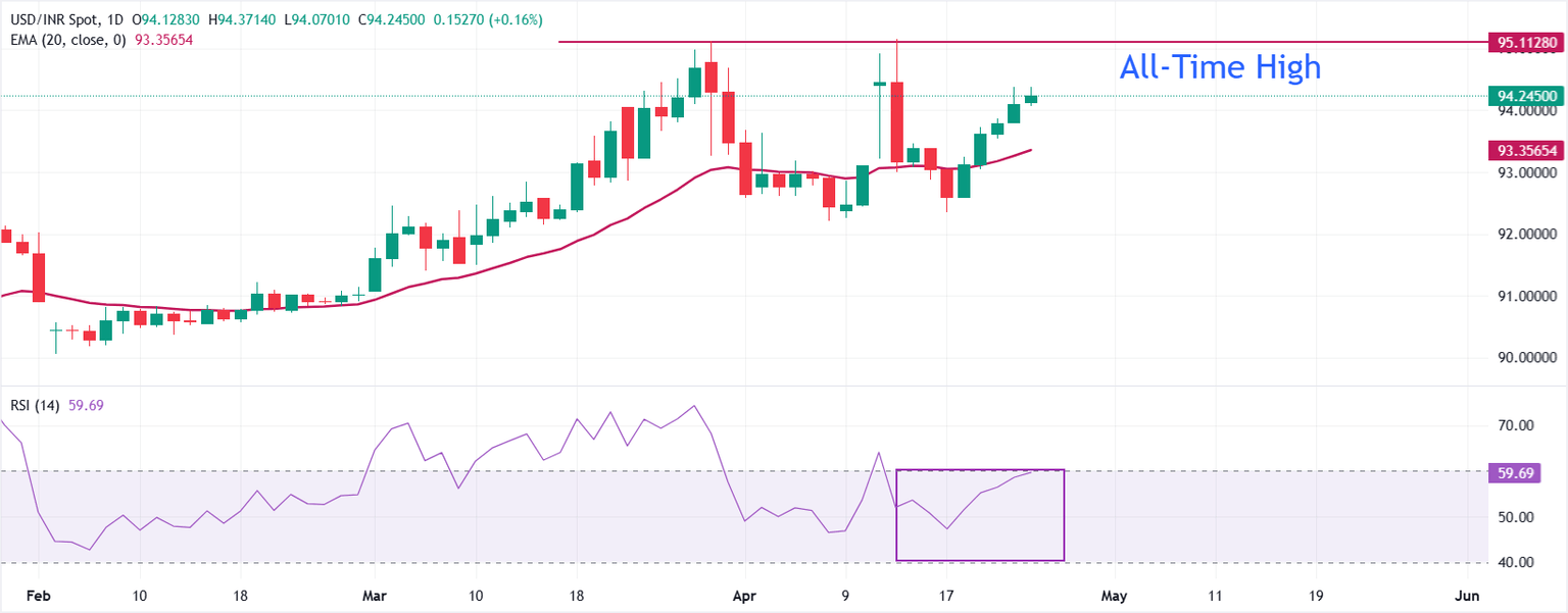 การวิเคราะห์ทางเทคนิค: USD/INR มุ่งมั่นที่จะทบทวนระดับสูงสุดตลอดกาลที่ประมาณ 95.20