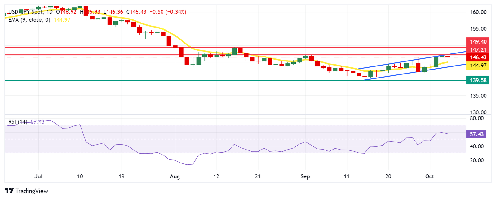 USD/JPY ซื้อขายที่ประมาณ 146.50 ในวันศุกร์ การวิเคราะห์กราฟรายวันแสดงให้เห็นว่าทั้งคู่อาจพยายามทะลุเหนือรูปแบบช่องสัญญาณขาขึ้น ซึ่งบ่งชี้ถึงอคติเชิงบวกที่เข้มแข็งขึ้น นอกจากนี้ ดัชนี Relative Power Index (RSI) 14 วันยังคงอยู่เหนือเครื่องหมาย 50 ซึ่งตอกย้ำแนวโน้มขาขึ้นที่ยังคงดำเนินต่อไป