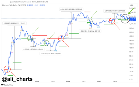 การเปลี่ยนแปลงของราคาล่าสุดทำให้การตั้งค่า TD อยู่ที่ประมาณ 2,250 ดอลลาร์ จากข้อมูลของ Ali Martinez การทะลุจุดราคาที่ต่ำกว่านี้อาจทำให้ราคาลดลงอย่างมาก หากค่าเฉลี่ยในอดีต 53% เกิดขึ้นซ้ำ Ethereum สามารถปรับฐานให้ต่ำได้ถึง 1,100 ดอลลาร์