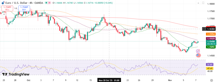 กราฟ EUR/USD 4 ชั่วโมงบ่งชี้ว่ามีการฟื้นตัวเล็กน้อยเนื่องจากราคาซื้อขายใกล้ระดับ 1.1550 ราคายังคงต่ำกว่าเส้น MA ที่สำคัญในช่วง 50, 100 และ 200 ซึ่งส่งสัญญาณถึงโมเมนตัมขาลงอย่างต่อเนื่องแม้จะมีการแข็งค่าเมื่อเร็วๆ นี้