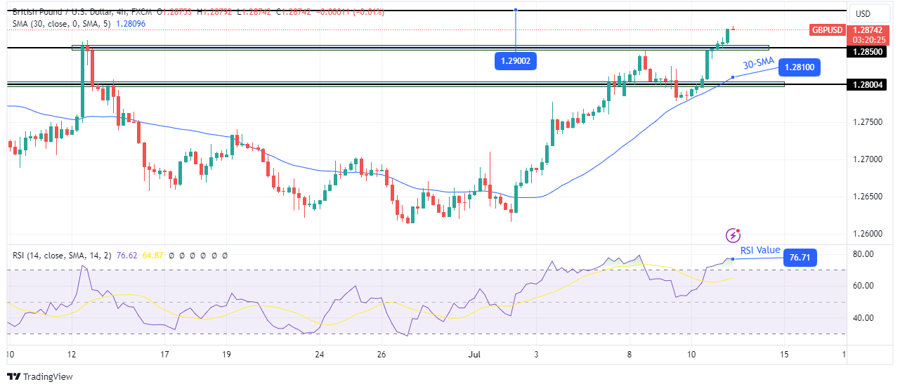 ด้านเทคนิค ราคา GBP/USD กำลังไต่ระดับขึ้นหลังจากทะลุแนวต้านสำคัญที่ 1.2850 แนวโน้มขาขึ้นมีความแข็งแกร่งเนื่องจากราคาเคารพเส้น SMA 30 เป็นแนวรับและสร้างจุดสูงสุดที่สูงขึ้น ในเวลาเดียวกัน RSI ก็ซื้อขายในบริเวณซื้อมากเกินไป ซึ่งสนับสนุนโมเมนตัมที่มั่นคง