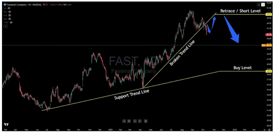 ในช่วงส่วนใหญ่ของปี 2024 FAST ได้สร้างสามเหลี่ยมสมมาตรแบบคลาสสิก โดยมีแนวรับเพิ่มขึ้นจากประมาณ 31 ดอลลาร์ และแนวต้านจากขาลงปิดจุดสูงสุด รูปแบบการบีบอัดนี้ยืดเยื้อเป็นเวลาหลายเดือน และแน่นขึ้นอย่างต่อเนื่องเหมือนสปริงขด จากนั้นก็เกิดการฝ่าวงล้อม ราคาทะลุผ่านเส้นแนวโน้มด้านบนและพุ่งขึ้นไปที่ $50+ ซึ่งเป็นเครื่องยืนยันถึงสิ่งที่เทรดเดอร์ทางเทคนิคหลายรายจับตาดู