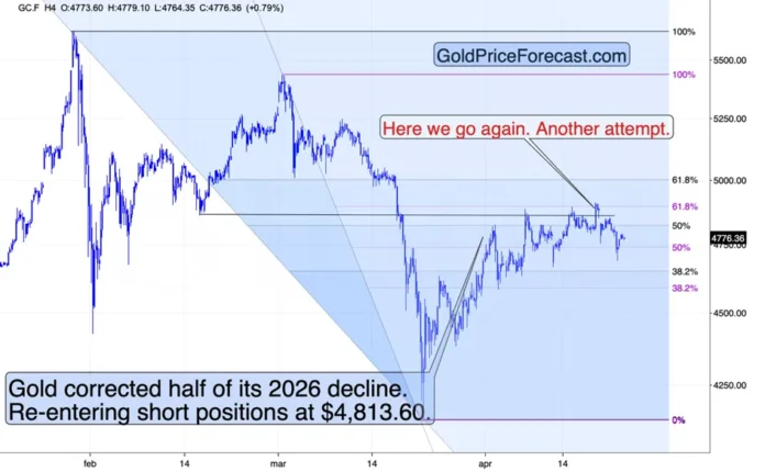 “ไม่มีอะไรใหม่ที่จะรายงานมากนัก นอกเหนือจากข้อเท็จจริงที่ว่าทองคำกลับมาต่ำกว่าแนวรับ 50% ระดับ $4,800 และกลับมาต่ำกว่าระดับที่ผมเขียนเกี่ยวกับการกลับเข้าสู่ตำแหน่งขายอีกครั้ง