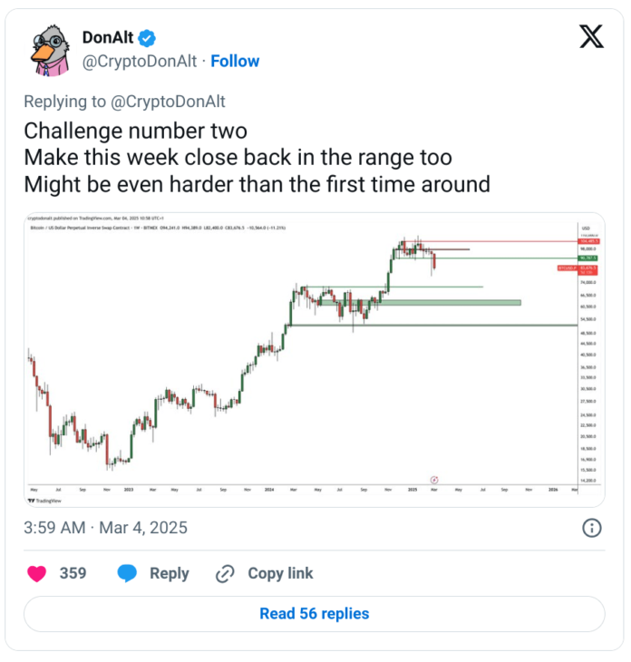 The pseudonymous crypto analyst DonAlt says he’s now seeking to see if Bitcoin can re-enter a weekly vary above $90,787 as a possible signal of energy amid a tumultuous time for world markets.